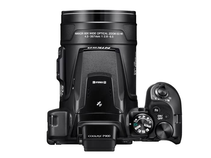 La nikon P900 no es una cámara pequeña. Su peso es de 899 gramos y es casi del mismo tamaño que una réflex digital de gama media. Tal vez por ello tiene un agarre excelente. La P900 tiene un controlador de zoom secundario en su lado izquierdo, lo que reduce las sacudidas de la cámara, tanto para imágenes fijas como videos. En la parte superior de la cámara nos encontramos con micrófonos zoom estéreo, así como los controles estándar.