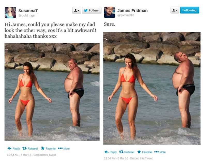 ¿Sabias que podías pedirle que retoque tus fotografías? Puedes pedírselo, pero esta claro que no sabes exactamente que es lo que va a hacer con tu foto. Normalmente se toma el asunto de la manera más literal posible y los resultados son realmente hilarantes.